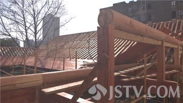 江苏省文化厅文物保护专家组表示,古建筑顶部木结构损坏都比较厉害,揭顶就是对顶部进行维修,做防水防腐。下面的结构不动。南京市文广新局文物处副处长 张国祥介绍,所有的木结构不动,把一些结构上,有一些腐朽的地方,按照我们现在新的处理的方式,比如讲顶升的方式,把糟朽的地方,替换掉。 在施工现场,工人们都是来自苏州金山古建园林建设公司,有着多年古建筑维修的经验。记者看到,一些新换上的木头柱子, 都要进行打磨和防腐防虫的措施。 一位施工工人介绍,这是新柱子,给它主体搞好后,上面快要搞好,毛糙的给他光磨,然后上油漆。并且新木料把皮一打掉之后,就有裂纹,有裂纹就给补上去。
