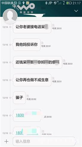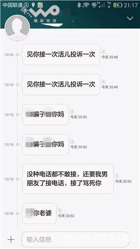 近日,专车司机吕先生十分郁闷,自己手机频繁接到恶意辱骂的信息,荔枝新闻网友获悉后联系到吕先生了解了事情的经过。 据介绍,12月16日下午吕师傅在察哈尔路接到南艺西门一位乘客的专车订单,由于是在晚高峰,路段较堵,吕师傅便打电话过去表明自己将花一些时间请对方等一下,接到电话的一名年轻男子说自己等不及,要取消,吕先生也同意了,便让对方在客户端取消此笔订单,但过了会吕师傅从自己的客户端发现男子并没有取消订单,就又打电话提醒了下。男子表示可能自己手机网络较慢,已经取消了。就在吕师傅调头前往草场门时,一个陌生号码的电话响起,吕先生接起后便遭到一位女孩的辱骂,质问司机怎么还不来接驾,吕先生反问说不是已经取消了吗?女孩表示,“取消的是我男朋友......”口中随即又是骂骂咧咧,吕师傅觉得无理取闹就直接把电话挂了,但没想到,过了不久女孩又开始连发几条短信乱骂,不仅辱骂自己妻子还叫嚣今后坐他车一次就要投诉一次,回家后,吕先生发现女孩发的几条骚扰短信内容实在不堪入目,想到该女孩在南艺后门叫车,声音听上去很年轻,他怀疑可能是南艺的学生,有必要教育下年轻人,于是吕先生联系了自己专车所属的南京卓迅汽车租赁公司的负责人,反映了情况。