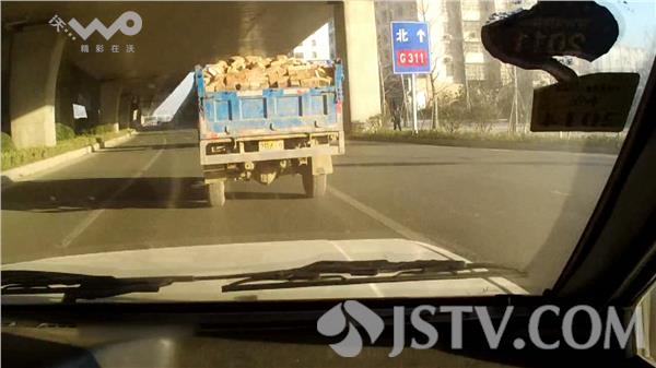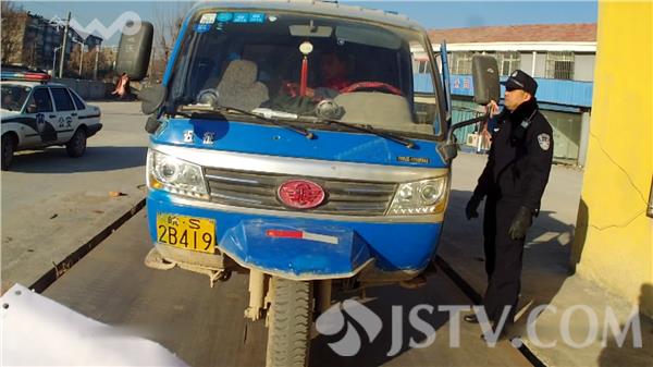 12月19日讯,昨天中午,徐州市泉山交警大队八中队民警,在三环西路高架桥下执勤时看到一辆低速三轮汽车由南向北行驶,因为后面拉了满满一车货物,民警指挥车辆靠边停车接受检查。没想到看到指挥手势后,该车驾驶员没有减速反而加速向前冲去,执勤交警立即上警车对闯卡车辆进行堵截。