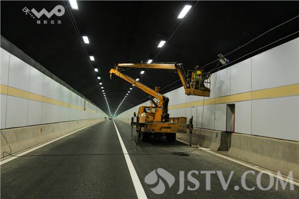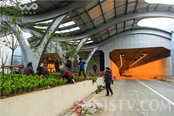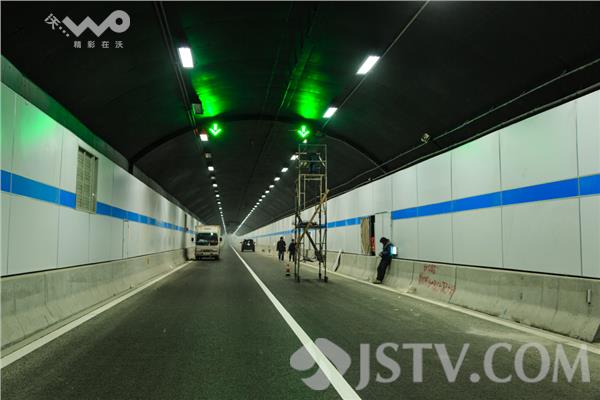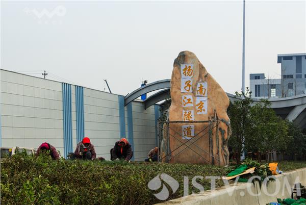 网友在江北隧道入口看到,一块3米高写着“扬子江隧道”的石头竖立在中间隔离带,特别醒目亮眼,绿化工人正忙着给石牌周围补种花草。隧道内也是一片忙碌,工人们有的在安装灯饰,有的在磨墙面,还有的在安装消防设备。大家都在做通车的最后准备。目前隧道工程仅剩下江南的古平岗和定淮门大街林业局门口附近的地面沥青尚未铺完,其它都已完工。