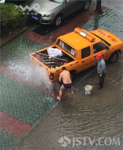 第一次没有修好,维修人员的衣服已经被喷射出的水全部浇湿,所幸他就一直“赤膊上阵”,冰冷的雨水和消防栓中的水不断打在这位”赤膊哥“的脸上和身上,他在雨水中赤膊足足有二十多分钟才把严重损坏的消防栓修理好,周围居民看到这样的场景很是感动。