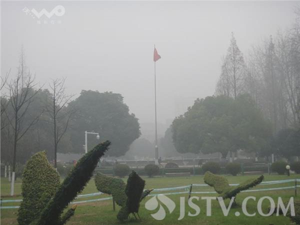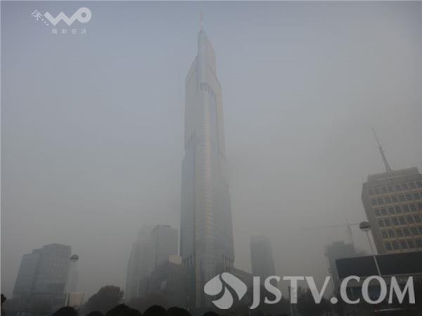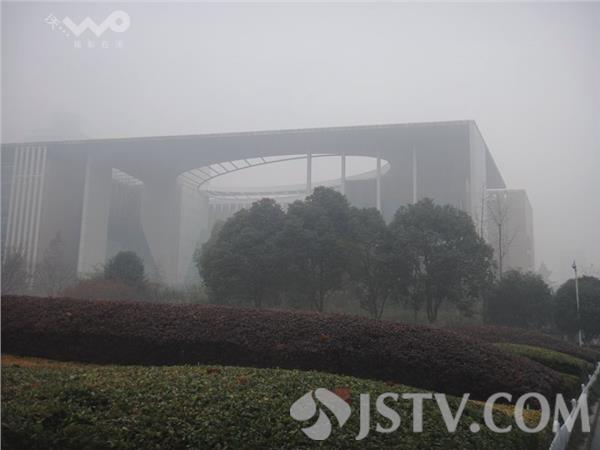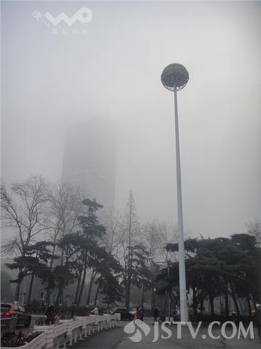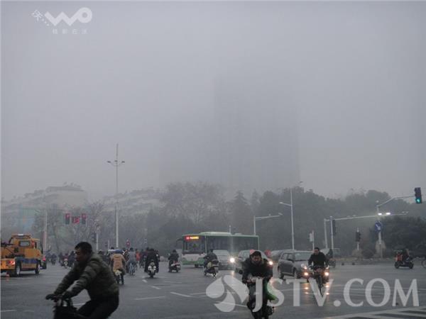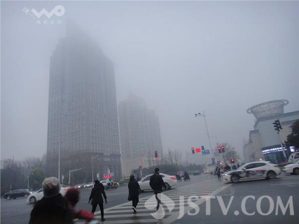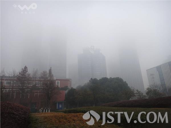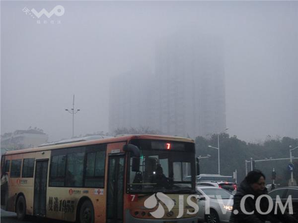 今晨(12月21日)南京浓雾锁城,能见度很低 。荔枝新闻网友上班途中看到许多车辆打开了雾灯,在上班途中缓慢行驶。