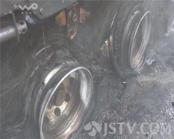 随后,车上明火被消防队员扑灭。轮胎烧爆,车身熏黑。所幸及时将车头与车身分离,将车头开地远远的,避免了车头遭大火殃及。目前,起火原因有待进一步调查。