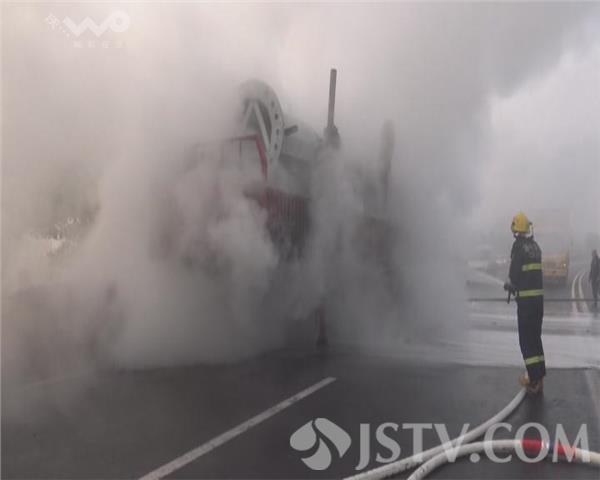 公路上停着一辆装载钢管的红色镇江籍半挂车,浓烟滚滚笼罩车身,地上有好几只用完的灭火器,车胎烧爆倾斜,巨大的钢管滚到一侧,随时有侧翻的可能。消防队员赶到现场,迅速铺好水管,展开扑救。据司机介绍,他车上装载了20多吨钢管从镇江开往泰州,当时刹车突然抱死,导致后轮车胎起火,他立即用灭火器自救,一度没救下来,只得报警求助。