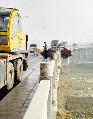 21日08:30,刘先生来电:在明远路跨二河大桥上发生一起车祸,一辆轿车撞断了桥边的栏杆,伸出半个车身悬在距离地面约30米高的桥边上,情形非常惊险。