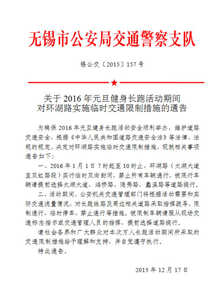 为确保2016年元旦健身长跑活动安全顺利举办,维护道路交通安全,根据《中华人民共和国道路交通安全法》等法律、法规的规定,无锡交警部门决定对环湖路实施临时交通限制措施,具体措施如下: