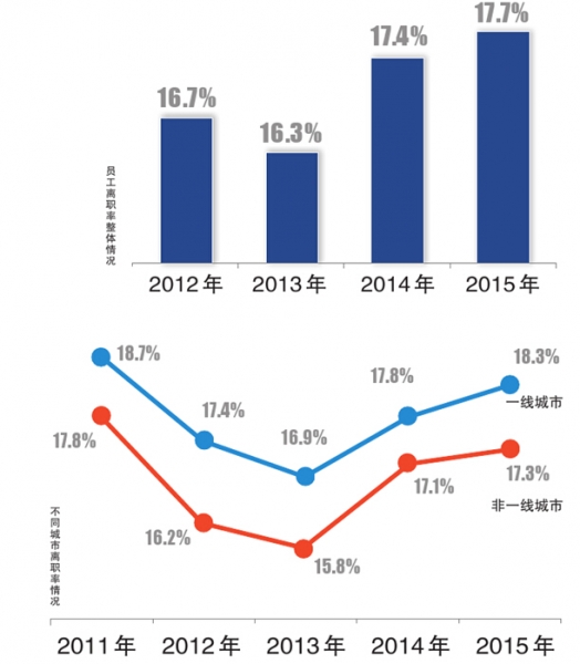 经济发展步入新常态,部分企业处在转型过程中。调查显示,制造业、传统服务业、消费品行业员工离职率处于领跑地位,分别为20.9%、19.8%和19.6%。