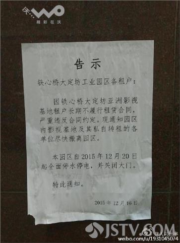 在影视基地大门外张贴了一则告示,上面写道:“亚洲影视基地租户长期不履行租赁合同,严重违反合同约定,目前已经被园区要求尽快搬离。”园区负责人表示,目前影视基地还拖欠了70几万的房租,没有办法他们才锁了大门。