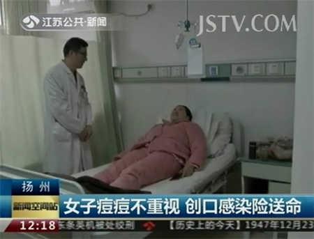 医生检查后发现,孔女士患上的是痈[yōng],主要是金黄色葡萄球菌感染引起的毛囊深部感染,严重者可继发毒血症、败血症导致死亡。因为感染面积不断扩大,医生随即为孔女士实施了手术治疗。扬州市东方医院普外科方金荣表示,当时医生在孔女士患病处发现了多个脓头,像这么严重的炎症,只是在教科书上曾经看到过的。