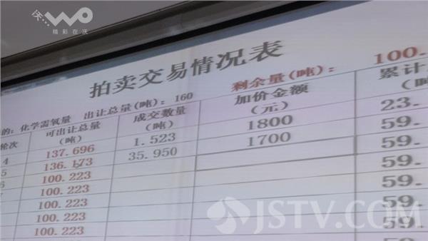 这里是南京排污权交易现场,交易采用的是竞拍的方式,看到第一个竞拍的是化学需氧量,采用的是基准价基础上加价的拍卖方式,化学需氧量基准价是每吨4500元。