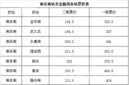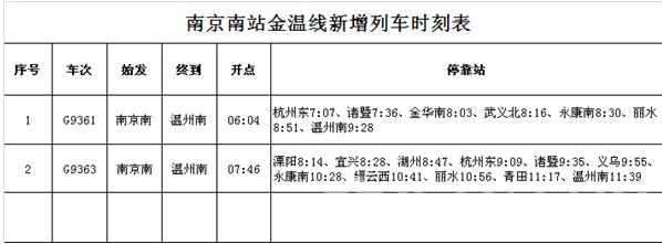 金温铁路开通后,铁路南京南站新添两趟至温州的列车。即南京南—温州的G9361次、南京南—温州的G9363次。相关情况可见图。