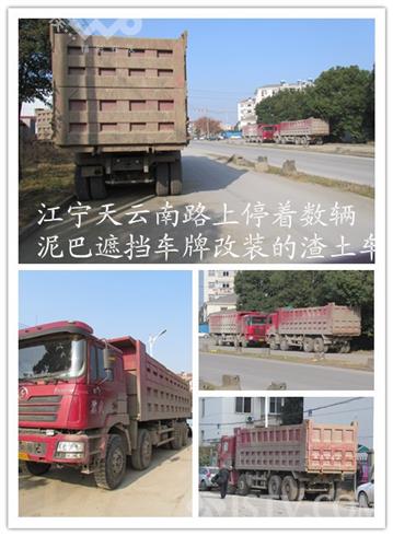 12月28日,在南京秦淮区运粮河西路停着一辆渣土车,前车牌戴了一只“手套”,后牌涂“泥巴”,车箱板也私自改装加高了。在(大里聚福城)沧麒路,道路两侧停了数辆渣土车加高了车厢板,唯独一辆渣土车特别刺眼,前车牌也戴上了一只脏“手套” 。在江宁天云南路33号,道路两侧停放着数十辆渣土车,前车牌干干净净,后车牌脏兮兮,渣土车也存在擅自改装、违法加高的现象。这些车辆上路行驶,不仅无法保证自身的安全同时也威胁到他人的驾驶安全。