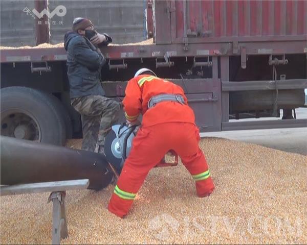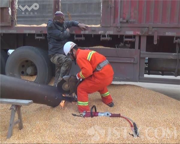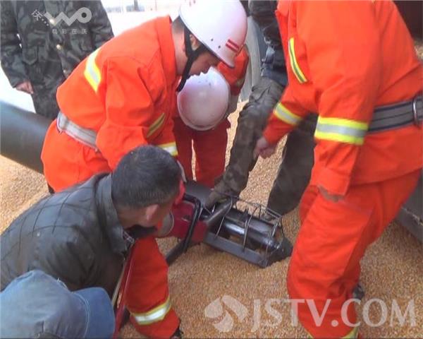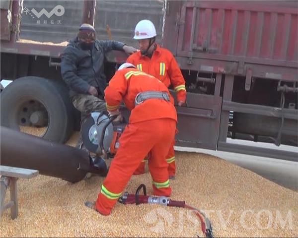 消防官兵到场后发现,一辆半挂车旁的地面上洒满了玉米粒,一名工友的右脚被卡在一个笼绞机里,因天气寒冷,经询问,工友脚部已失去知觉。消防指挥员立即下令,展开救援工作。