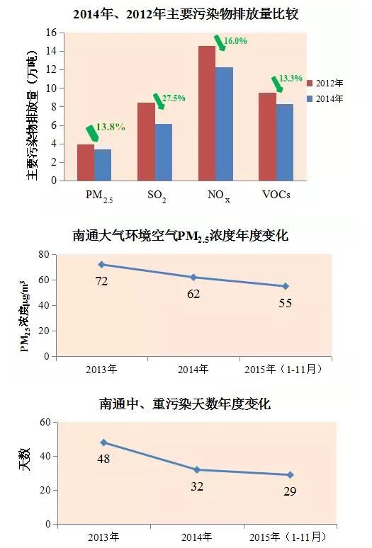 经过前期的努力,污染物排放量实现下降,2014年PM2.5、SO2、NOx、VOCs比2012年分别削减了13.8%、27.5%、16.0%、13.3%;PM2.5浓度持续降低,2015年比2013年同期下降了16.7%;中、重度污染天数逐年减少,2015年比2013年同期减少了19天;我市空气质量得到逐步改善。