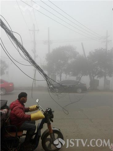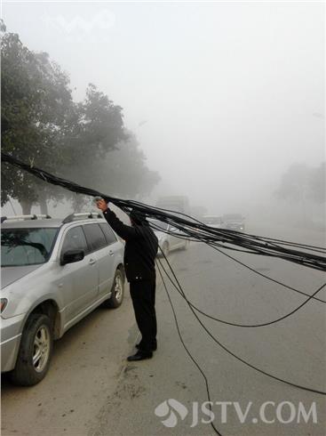 今天(12月31日)早上扬州由于大雾天气,在扬州望江路施桥段由于大雾能见度低,有车辆刮到本来就有段悬在半空电缆线,经过拉拽使电缆线杆断裂所幸倒在树上,线缆中间部分落地严重影响交通,这时有位路过城管小哥手举线缆,帮忙车辆通过,受到市民点赞。