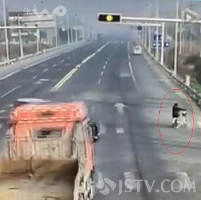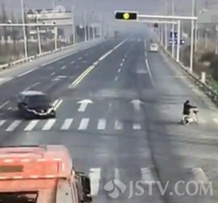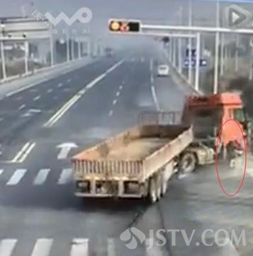 今日(12月31日),在泰州靖江新桥镇德胜村红绿灯处,南北向沿江公路与村道交叉路口,一辆货车与拐弯汽车相撞,大货车避让不及撞倒了红绿灯杆,而此时有一人正推着自行车闯红灯过马路。