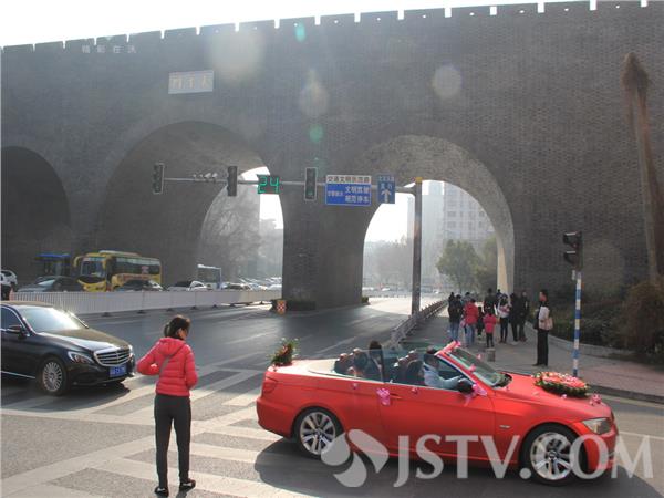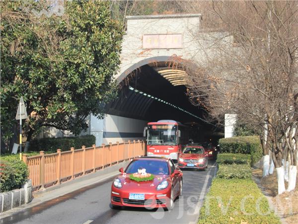 新年“嫁”到,南京元旦假期内,吸引上百对新人办婚宴。今天是新年的首日,南京玄武区的太平门和富贵山交通繁忙,在现场看到,上午共有上百婚车队经过,都是来入“太平”沾“富贵”“彩头”的。 上午,在太平门和富贵山隧道出口处看到,就有上百婚车队经过。