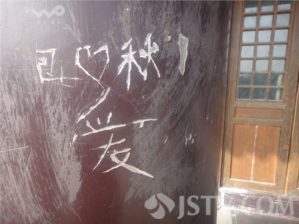 经仔细观察,发现这些刻画在凤凰阁上的多为刀刻,深浅程度不一。有的刻在木础上,有的刻在横梁上。其内容大多为:“XXX到此一游!''XXX我爱你'等字样。而写在凤凰阁基座上的则多为一些:'XXXSB'''XX呆子”等低级趣味和不文明用语,看后令人作呕。正在凤凰阁台阶上做小买卖的刘大妈说:在这乱涂乱画的确实比较多,不仅有小孩子,而且有大人,在好端端的大柱子上乱刻画的确不象话,好在现在许多已经被重新出新的油漆摭盖掉了。