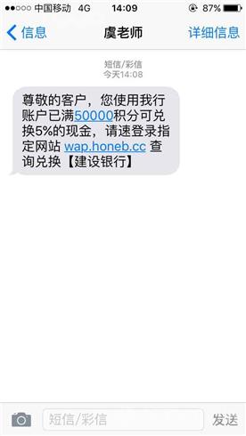 今天,元月5日下午,荔枝新闻网友向我们反映,他收到一则短信,内容是:“尊敬的客户,您使用我行账户已满50000积分可兑换5%的现金,请速登录指定网站 wap.honeb.cc 查询兑换【建设银行】”眼下,电信诈骗短信满天飞,上述信息是真实的吗?