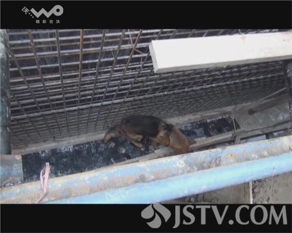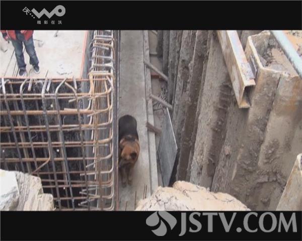 据民警介绍:昨晚这个坑在不用的时候盖上了彩条布,当时狗可能没注意,连同彩条布一起掉入了坑内,一直到今天早上才被工人们发现。