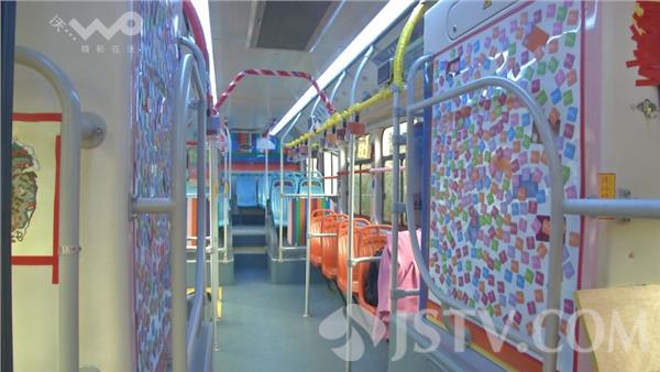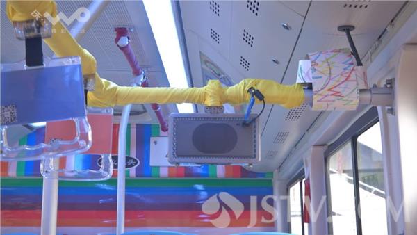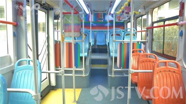 南京艺术学院学生介绍,都是一些先锋派的绘画涂鸦,画在整个车辆的外部包括内部,给人一种轻松愉快的感觉,车里播放的音乐是同学们自己编写的音乐作品,可能有京剧大鼓 电子乐 空灵的元素,会在这个公交车里循环播放,听起来会让人感觉很放松。 参与设计的同学介绍,这辆公交车,是南京艺术学院73名同学,花了1个多月时间,打造而成。依据它本身的线路,会途经南京的新街口、珠江路等人流密集的站点,和很多市民近距离接触 。南京艺术学院学生表示,因为现在的人生活节奏很快,很多人上了公共交通工具之后,就会低着头盯着手机,没有办法和周围的人交流,同时也会错过很多风景。希望通过这样一种方式让他们从心态上慢下来,通过视觉 听觉上的眼前一亮能够亲身感受不一样的世界。