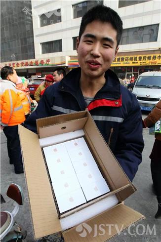 1月7日下午,石家庄市快递员刘东辉从当地环卫工人朱伟旗手中接过一整箱苹果6s手机,“这一箱手机共10部,价值5万元,如果找不到,后果不敢想。”刘东辉紧握朱伟旗的手连声道谢。当得知眼前这位好心的环卫工人是来自江苏盐城时,刘东辉拜托当地的记者联系江苏的媒体,要好好表扬这位来自江苏盐城的环卫工人。