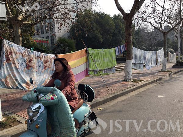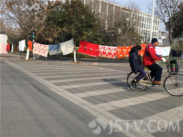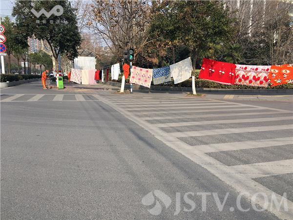 9日下午,笔者经过南京市鼓楼区六车道的景观南瑞路,看到路边栽植了数十棵的香樟树与香樟树这间拉起了绳子,绳子上挂上了花花绿绿的被子,笔者估计至少数少条,行人车辆在此经过,很影响美观。有市民说,漂亮的景观路,晒这么多的被子不美观,也不卫生,应该到自己的楼顶或者不是沿街的地方晒比较好。