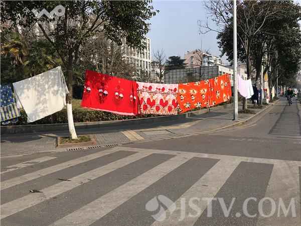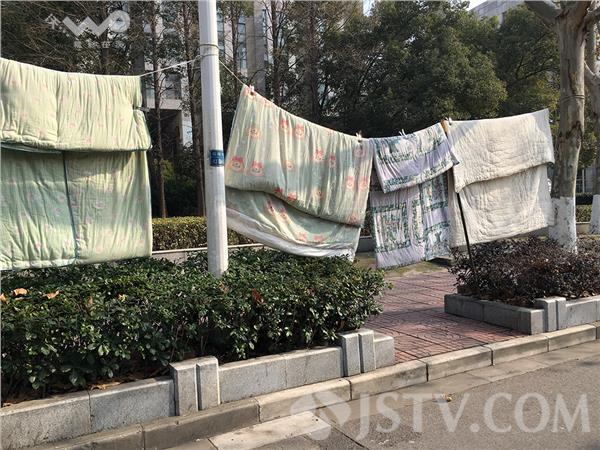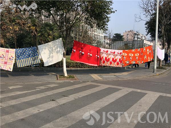 周六(9日)下午,阳光明媚,南京鼓楼区南瑞路,数十家店铺一起抱出床上的棉被,跑到马路人行道上晒,红的红绿的绿,五颜六色,大大小小数十块连成一排,不太美观。
