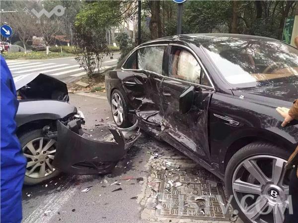 现场看到,一辆黑色宾利轿车右侧车壳明显受损,大面积向内凹陷,旁边斜停着一东风日产轿车的黑色轿车,其车头受损。