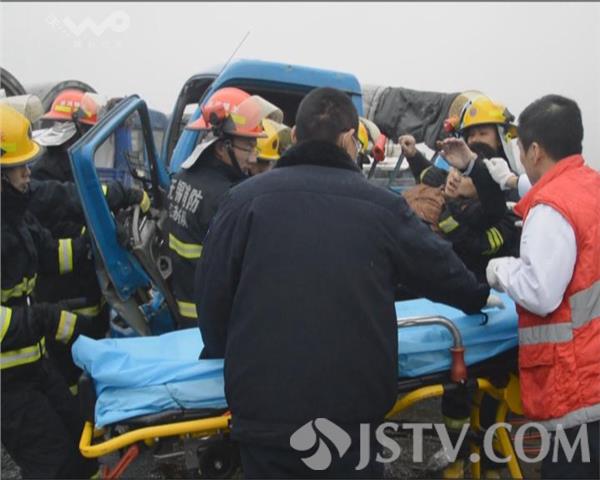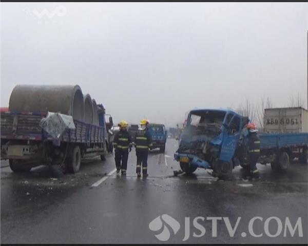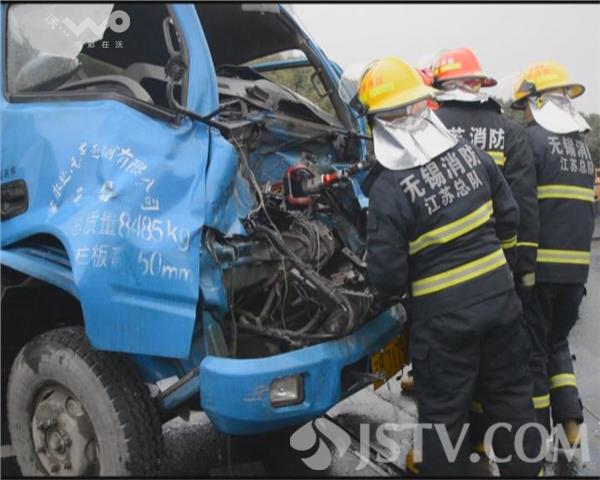1月11日上午11点,312国道往上海方向无锡锡山段发生一起交通事故,三辆货车因意外发生追尾碰撞,其中追尾车辆驾驶员被困在驾驶室中无法动弹。