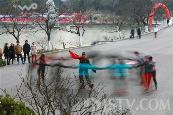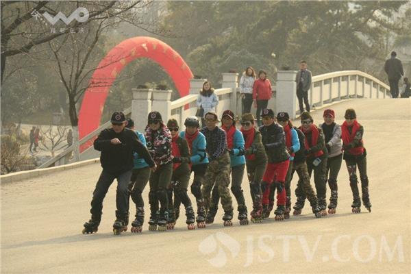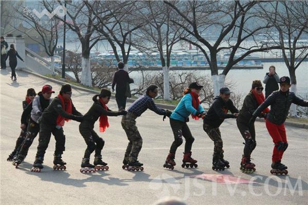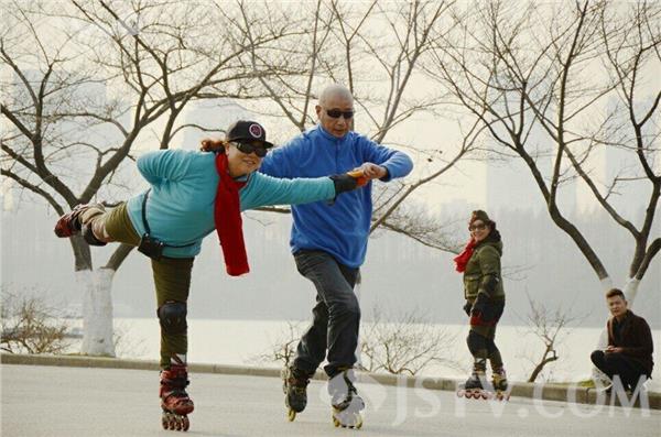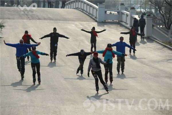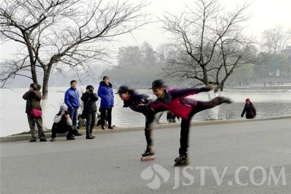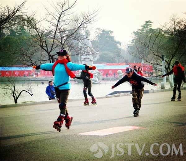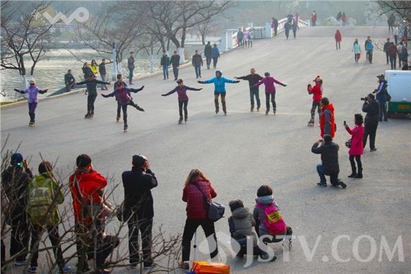 昨夜(1月11日)今晨,南京雪花纷飞,迎来2016年第一场雪,今天南京最低气温下降到了零下2度,户外运动的市民明显减少,不过在南京玄武湖畔,一支名为“凤凰传奇轮滑族”的大叔大妈们丝毫未收天气影响,他们一如既往地脚踩滑轮、身着运动装,在刺骨的寒风下,在昔日六朝时期水上练兵的玄武湖畔“冬练三九”。他们漂亮的装束、不断变幻的优美队形、各式娴熟的滑行动作在各种动听乐曲的伴奏下,显得更加潇洒和美丽。