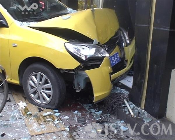 事故现场,一片狼藉。这辆出租车在撞到这家金店门口的铁柱子后停了下来,车头部位严重受损,两个前轮均已爆胎,金店的玻璃门被撞碎,一台立式空调被撞倒。据出租车司机称,事发当时,他带着一名乘客正常行驶,突然一辆电动车从文昌巷路口冲了出来,他赶紧急刹,但由于路面湿滑,导致车辆失控撞上了金店大门,车上乘客也受了轻伤。目前,南京交警二大队正在对此事做进一步调查处理。