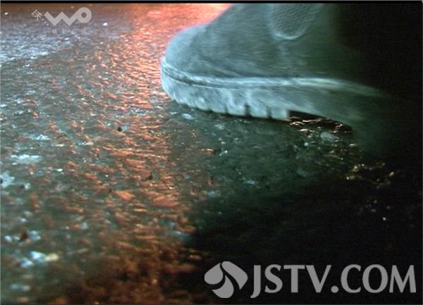 记者看到,在此处路面上出现了几十米长的冰袋,走在上面稍有不慎就会滑倒。就在记者采访时,不远处又有一辆面包车失控,撞上了路边护栏,导致轮胎爆胎。