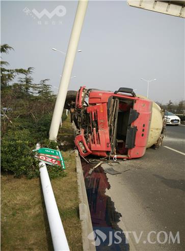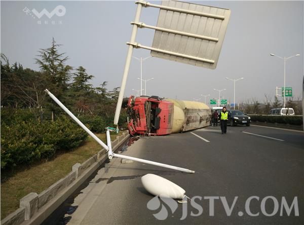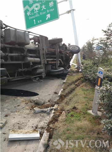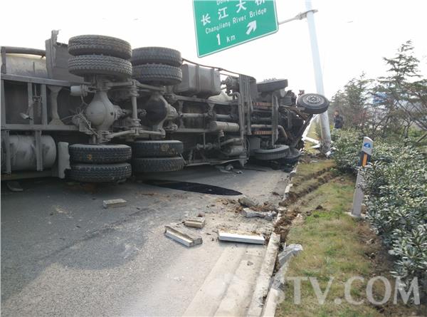 1月14日上午11:20点左右,南京浦口宁六公路快速通道邻近北源大厦不远处,一辆由北向南正常行驶中的大型槽罐车,突遇前方小车急速变道,一时避闪不及,一头冲上路边花坛,巨大的惯性力瞬即将路边一座路灯灯杆撞倒,并在撞断另一路牌立柱后侧翻。事故中槽罐车摔出去10多米,事后司机艰难从驾驶室内爬出,所幸并未受伤。司机随后报警。