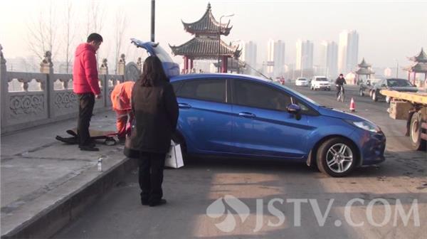 1月15日早晨7:40分,在淮安市区八亭桥上看到,由于近400米长的路面结冰,接连引发多起单方事故所幸没有人员伤亡。现场看到清障车正在对一辆避让行人撞上路牙的蓝色福特轿车进行清障,该车前车头部位受损严重无法启动,