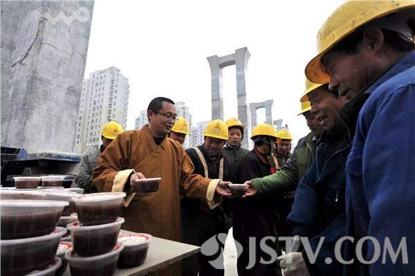 今天是农历腊月初八“腊八节”。 一大早,盐城市区内环高架桥建设工地上的工人们就喝上了永宁寺的僧人和爱心市民送上的腊八粥,工人们喝着热乎乎的粥,工地上随即飘荡起腊八粥香和工人们开心的笑声。同时,盐城永宁寺和有关爱心企业在市区设立了13个施粥点,共同送出了1万多份腊八粥,一碗碗香甜热乎的腊八粥,为人们带来了温暖,送上了祝福。
