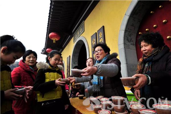 据介绍,盐城永宁寺和有关爱心企业为了让市民在腊八节喝上浓香的腊八粥,早在一个星期前即着手准备,挑选了香米、莲子、桂圆、红豆、花生、核桃、薏仁、红枣等10多种食材,由专业厨师精心熬制而成。