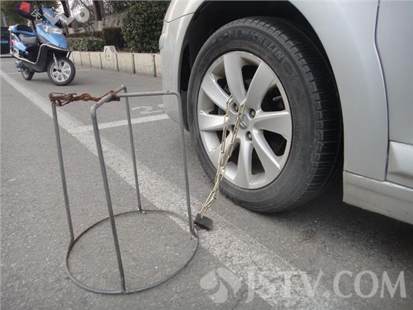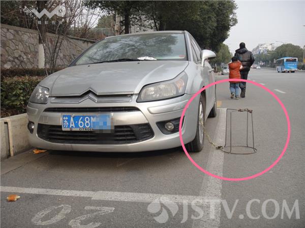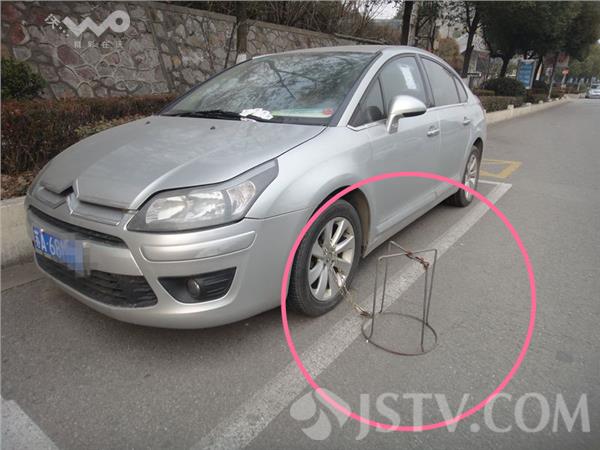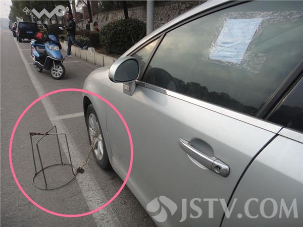 今天(1月18日)上午,荔枝新闻网友途经南京城南郁金香路时看到一辆私家车的前轮上用铁链子栓了只铁板凳,这让人觉得好奇不已。为此,网友停车探个究竟,据观察,这辆私家车所停的地带是马路上的划线收费车位。除车辆前轮被栓凳子外,车窗玻璃上还张贴着一张张的告示单。附近的收费员赵师傅介绍,告示是他们停车办张贴的。原因是该车自今年元旦起,已经占用收费车位半个多月了,所累计的停车费用已达2000多元。他们担心驾驶员乘人不注意逃费将车辆一开了之,于是出此下策用板凳栓住轿车前轮。