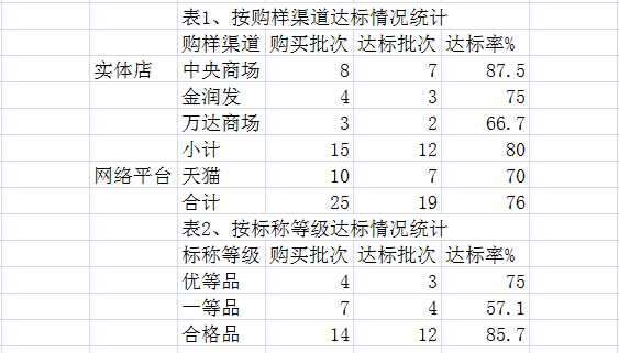 从本次试验结果来看,市售实体店整体达标情况略高于网络平台,在实体店中,中央商场购买的达标率最高,达到了87.5%,从标称的等级达标情况来看,合格品的达标率最高,一等品的达标情况较差,仅为57.1%,这主要是一般合格品的技术要求相对较低,比较容易达标的缘故。