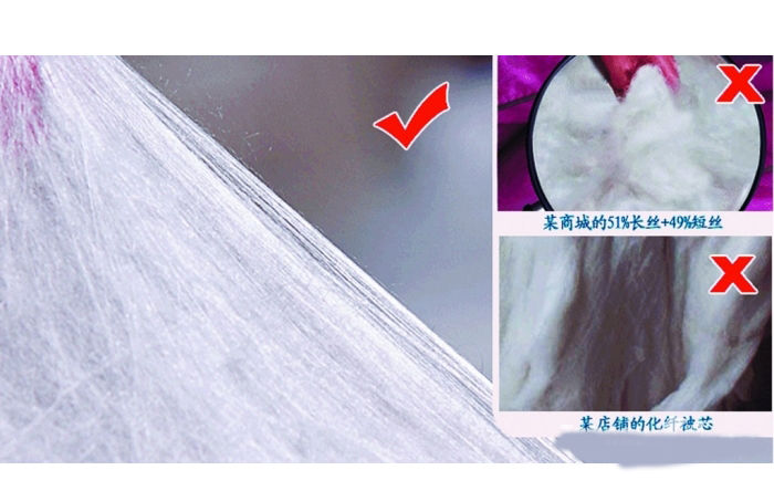 本次比较试验的不达标项目为:填充物品质、填充物含油率、胎套纤维含量、标识。有些蚕丝被只标注了重量,但是没有标明究竟是总重,还是纯蚕丝的重量。省消协消费指导部赵鑫: