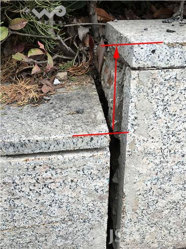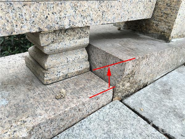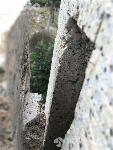 汉中门大桥西引桥南北两侧人行道,由于地基下沉,大理石栏板与立柱分离,缝隙能插入一只手,目前仅靠另一端榫头与立柱连接,栏板有倒塌的风险。