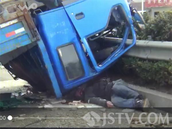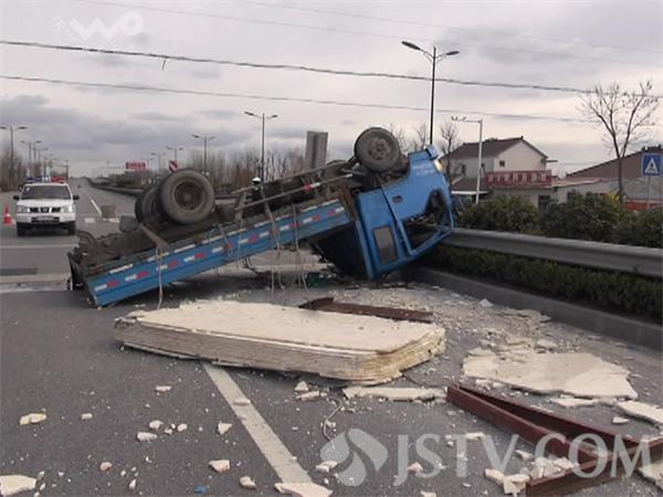 1月20日中午12点左右,盐城市大丰区疏港公路干河大桥西附近的十字路有一辆装大理石的货车为了避让一辆电动车横穿马路,货车也因猛打方向撞上路中间的隔离栏后翻车,电动车驾驶
