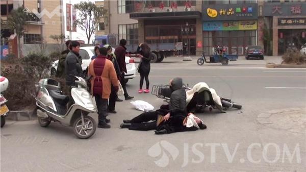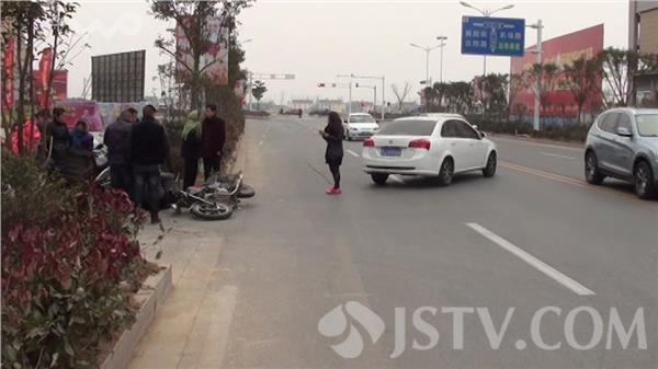 记者赶到现场时看到,一辆摩托车倒在由南向北的慢车道上,摩托车的驾驶员正坐在地上,摩托车的另一位乘坐者躺在马路上,左胳臂疑似已经断了不能动弹,正打电话与家人联系。一辆白色小型轿车车头向南斜停在马路上,左前门车窗玻璃破碎,车门变形。