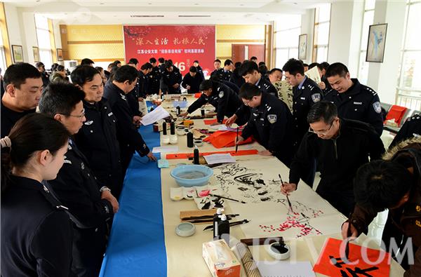 当天,许丽晴一行来到“全国公安机关爱民模范集体”、“全国一级公安派出所”——淮安市公安局淮阴分局王营派出所,参观了派出所的接待大厅、社区警务室、市民学校、见义勇为工作站、恩来精神学习室、勤务指挥室等,对该所的警营文化建设工作给与了充分肯定。在举行了简短的《江苏公安作家丛书》赠书仪式后,许丽晴向淮安市公安局淮阴分局赠送了自己精心创作的国画作品《烟雨苍茫江上歌》,艺术家们也送上了自己带来的书画作品,并现场挥毫泼墨,为基层民警写春联福字、题词作画、送去节日祝福。在处处充盈着浓浓节日氛围的活动现场,书画家们热情挥毫泼墨,绘画作品或写意、或工笔,或山水、或花鸟;书法作品或行草、或隶篆,或横幅、或中堂,件件作品功底深厚、艺术品位高雅,笔精妙墨之中映射出各位艺术家们深厚的艺术造诣,丹青翰墨之中传递着他们对基层一线民警的殷切关怀,经过近3个小时的活动,书画家们共书写、绘画出近百幅各式春联、福字和书画作品,全部赠送给了到场的民警代表。“泼墨挥毫送春联,警民一家贺新春”。最后,所有书画家和民警们合影留念,将活动氛围推向高潮。