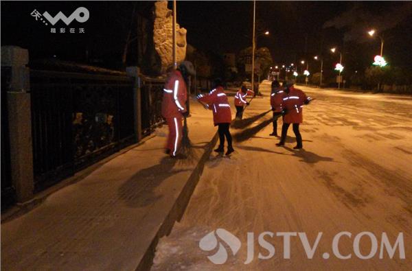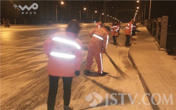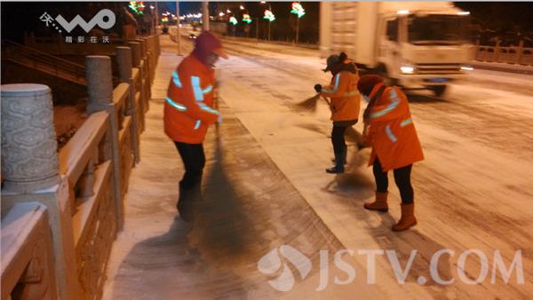 1月23日凌晨3点开始,淮安市区全体环卫工走上街头在淮安各个主干道,桥梁,学校,路口等重点路段进行清扫积雪,记者在北京南路上的华兴桥上看到,这里通往桥面的积雪早已被清除干净,大堆积雪被铲除在道路两侧,路中间积雪和冰凌被环卫工们手中铁锹全部铲除,二十多名环卫工正在集体对桥面进行地毯式清除。