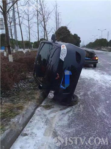 1月23日讯,南通降雪小事故频发,天冷路面打滑。南通市郊区路面结冰。电动三轮在红灯面前飞速,刮倒正常行驶中的电动车。郊区路口小事故频发,希望市民出行谨慎驾驶。