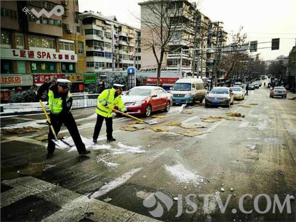 据南京交管局有关人员介绍,昨晚起,南京各交警大队民警坚守岗位,疏导交通,播撒融雪材料,铲除道路积雪,确保道路畅通。