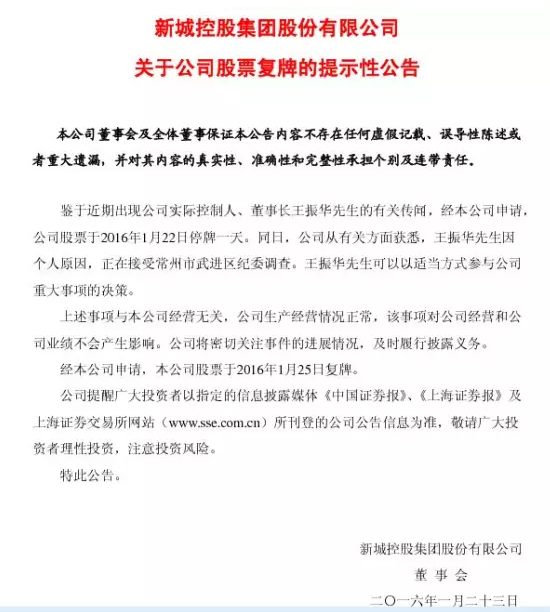 新城控股1月22日晚间公告称,公司于当日从有关方面获悉,公司实际控制人、董事长王振华因个人原因,正在接受常州市武进区纪委调查,其可以以适当方式参与公司重大事项的决策。