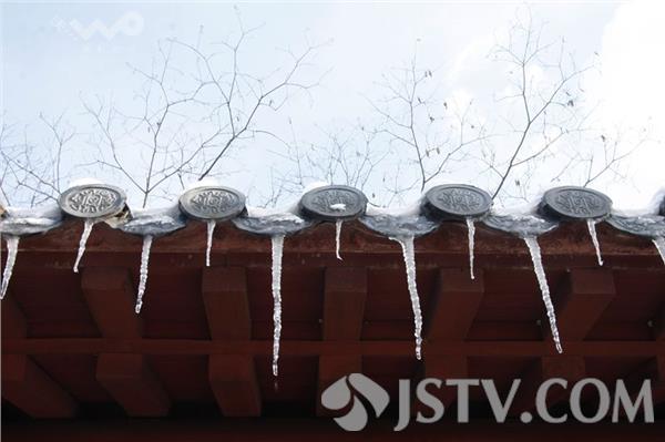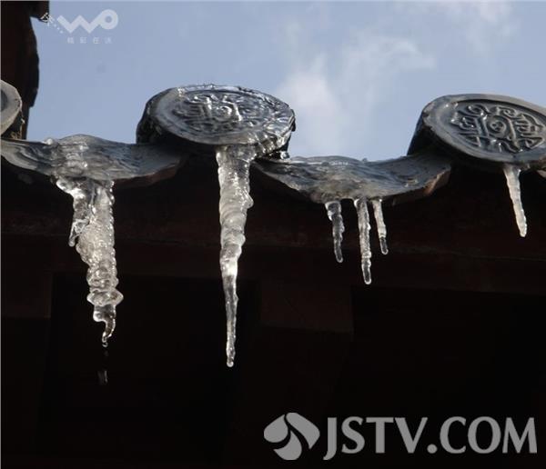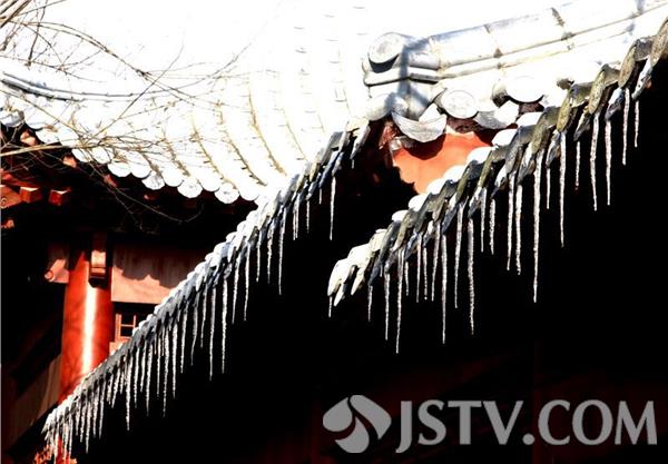 “霸王级'寒潮来袭,今天南京城北风呼啸、滴水成冰,最低气温下降到了零下10度,为25年来气温的最低极。今天下午荔枝新闻通讯员在南京东郊红楼艺文苑看到了冰棱成排挂的难得景象。公园管理人员说,类似情况已经多年没在见到了,如此多的冰棱成排挂在屋沿上还真是壮观。