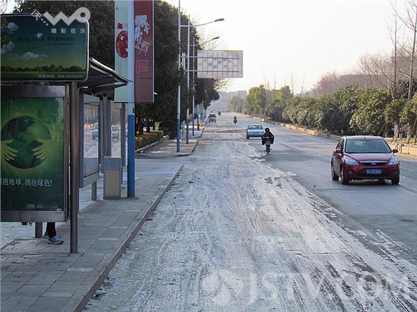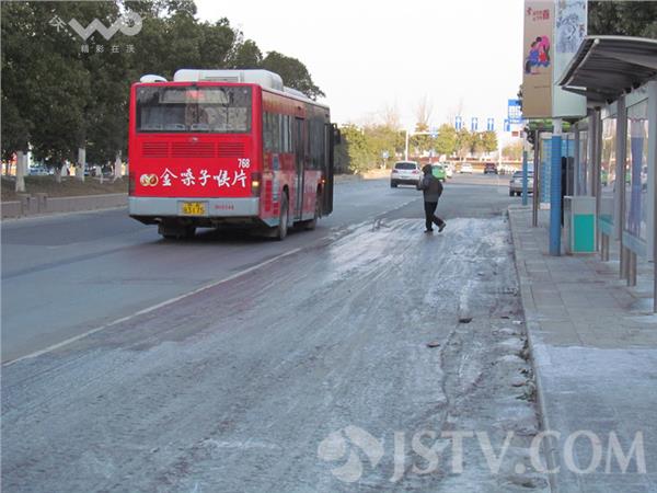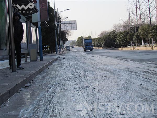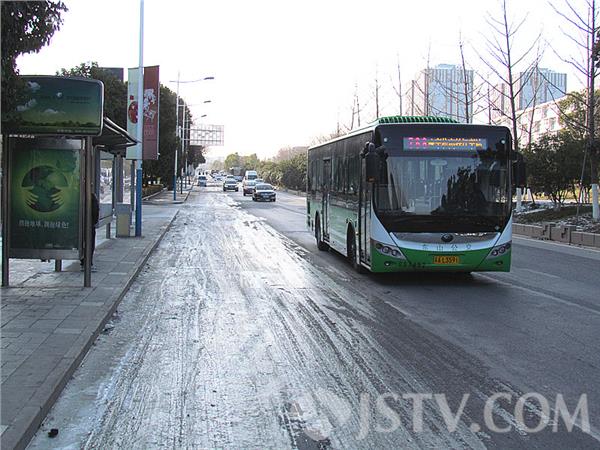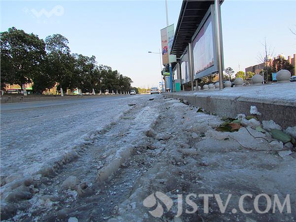 这条“冰道”位于南京软件大道,笔者驾车从宁丹路口到花神大道转盘,发现大约有几百长,宽约二、三米。占据了一条辅路。在该公交车站,有4条公交车靠站,上下车的居民较多。据附近李女士讲,她每天在此乘车,冰道已有两天了,辅路很快成了“滑冰场”,存在安全隐患。笔者观察了约半小时,不少公交车,进不了站台。为了方便乘客上、下车,司机将车停在“冰道”以外的位置,乘客走在“冰道”上,小心翼翼。由于气温下降较快,路面有的背阳,很难熔化,道路都成了“冰道”,给机动车行驶造成了很大障碍。